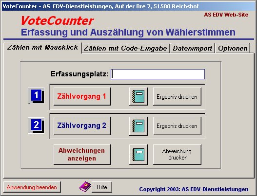 Bei VoteCounter gibt es keine Strichlisten mehr, nur noch die Ansage des Kandidatennamens und einen Mausklick oder alternativ dazu eine Kandidatencode-Erfassung. Die Kandidaten können komfortabel mittels Datenimport aus den Wahlprogrammen von AS EDV-Dienstleistungen per Mausklick übernommen werden.
